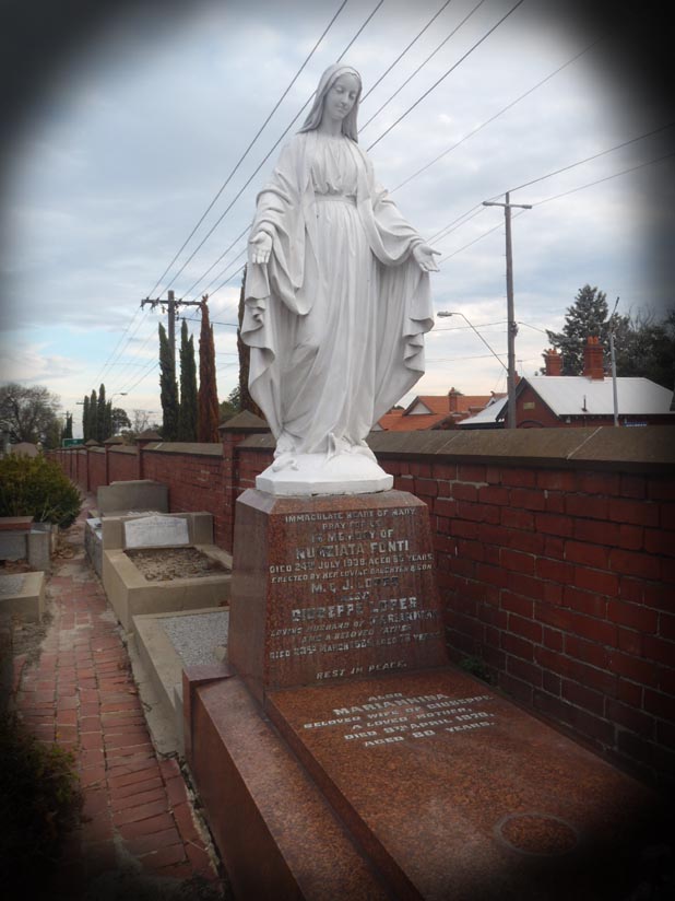 I arrived at 4pm, which I admit was cutting it a bit fine as the cemetery closes at 4.30. I wandered around checking out dates and inscriptions. New and old graves seem to be mixed up higgledy piggeldy. I headed towards a Mary statue right next to the western fence. Every time I drive pass that wall all you can see is Mary peering over it, arms reaching out to drivers and pedestrians.